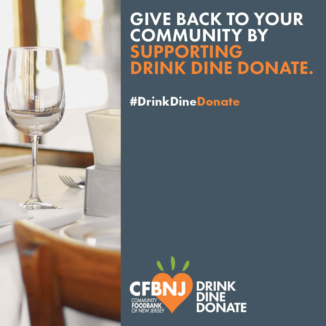 Drink Dine Donate is a statewide initiative harnessing the reach and influence of the hospitality industry to raise awareness of food insecurity and to collect funds for the Community FoodBank of New Jersey (CFBNJ). CFBNJ work with more than 800 community partners (food pantries, soup kitchens, shelters, child, and senior feeding programs, etc.) across 15 counties to distribute nutritious food in the communities they serve. For every $1, CFBNJ can provide 3 meals for our neighbors in need.