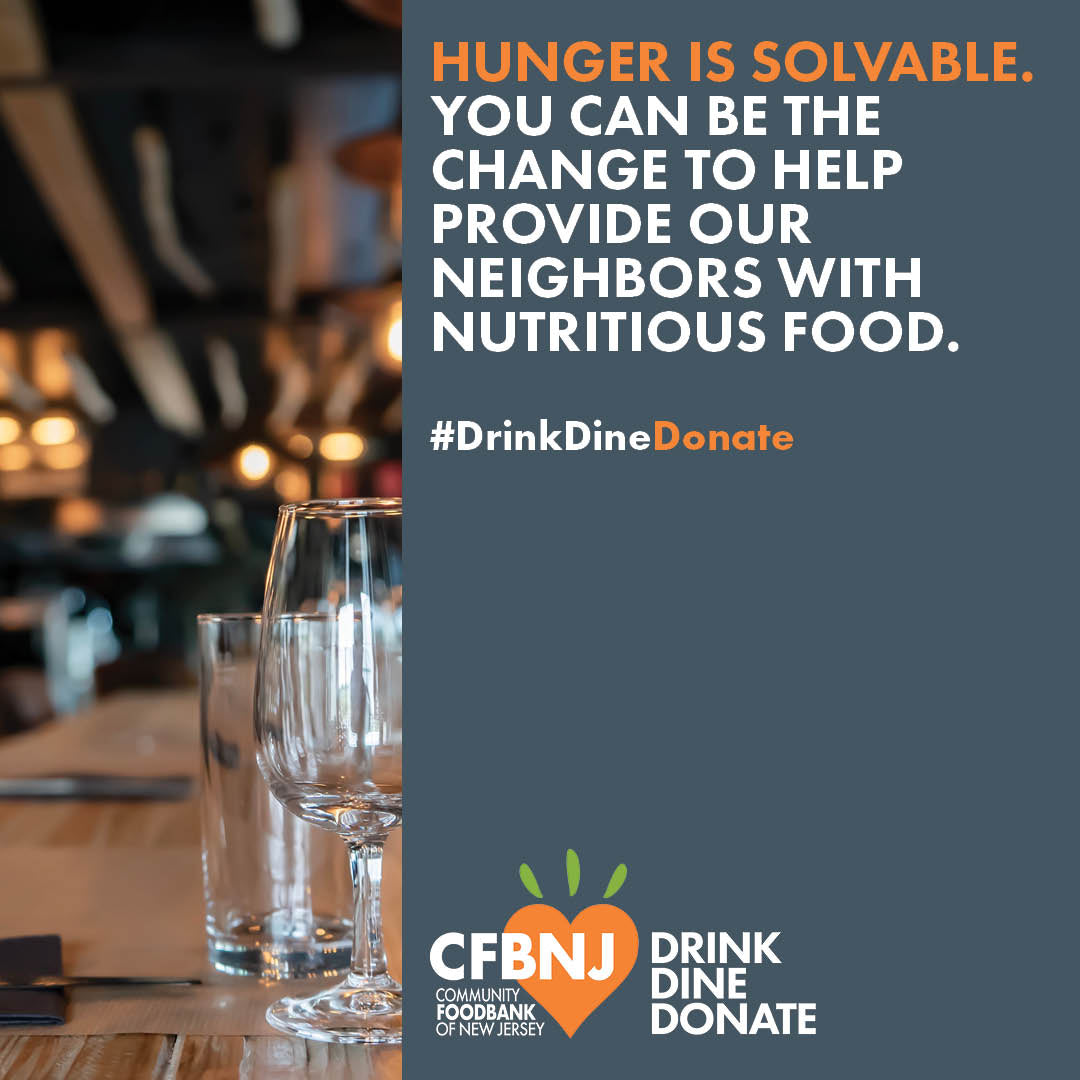 Drink Dine Donate is a statewide initiative harnessing the reach and influence of the hospitality industry to raise awareness of food insecurity and to collect funds for the Community FoodBank of New Jersey (CFBNJ). CFBNJ work with more than 800 community partners (food pantries, soup kitchens, shelters, child, and senior feeding programs, etc.) across 15 counties to distribute nutritious food in the communities they serve. For every $1, CFBNJ can provide 3 meals for our neighbors in need.